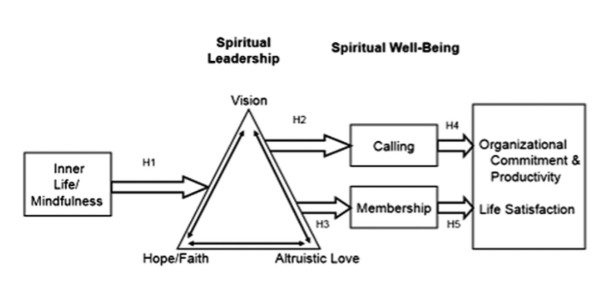 Inner life is the beginning of the model and is the wellspring of spiritual leadership. Inner life includes an individual’s faith, identity, self-esteem, and personal values. When we nurture our inner life through self-reflection, purposeful living, authenticity, and spiritual development, our capacity to lead spiritually increases. Spiritual leadership, according to the model, consists of three components – hope/faith, vision, and altruistic love – all of which are inextricably connected. Leading spiritually means providing a picture of a desired future, instilling the hope and faith that it will happen, and genuinely caring for others and helping them to grow and succeed. When we exercise spiritual leadership, the outflow is a sense of purpose and belonging, which then results in greater life satisfaction, and organizational commitment and productivity.