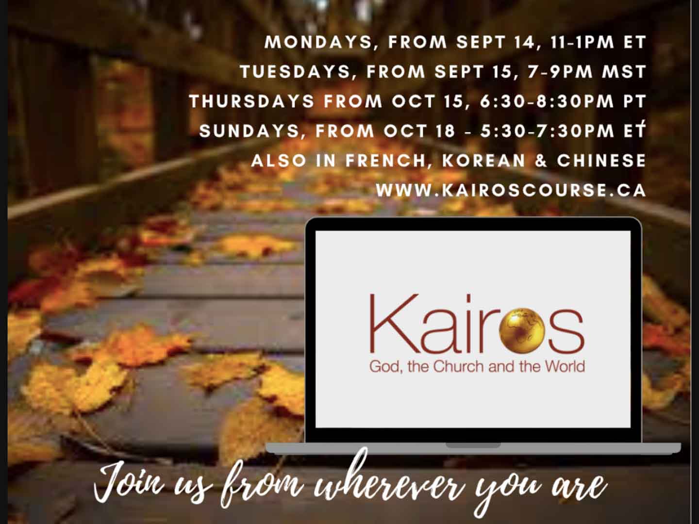 There are many opportunities to take the Kairos Course this fall, and you can participate anywhere in Canada - even from the comfort of your own living room.