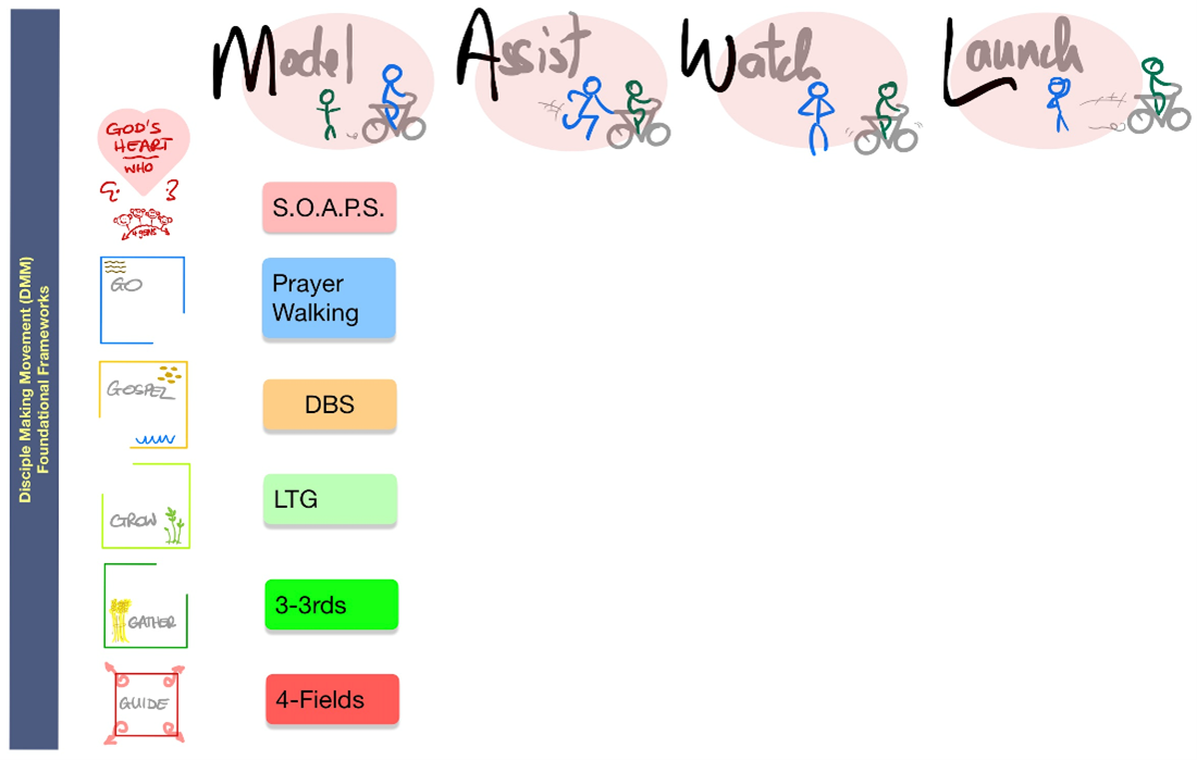 Let’s look back to the previous article which explored the foundation framework of DMM called “God’s Heart in Four Fields”. Let’s imagine that our leadership team is asking, “What tools do we have to teach our disciples to connect to God’s Heart, starting with listening to Him through reading the scriptures?” Someone pipes up, “I know, the S.O.A.P.S. process is really easy to learn and use!” So that week we go off and introduce S.O.A.P.S., each to our handful of disciples. We (MODEL) for them how to do it. We spend a longer time in the (ASSIST) phase, over several weeks, making sure they really get how to do it, and experiencing the benefits of the process. Over the coming months, we (WATCH) for consistent competence, and even encourage them to start training others in how to use S.O.A.P.S. just like my son taught his little sister to ride a bike.
